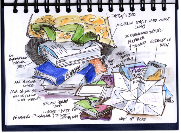 Each little thing we learn about traveling brings a feeling of accomplishment and a more secure sense that we probably won’t get shot when we hit the beach… or the plane exit ramp at Rome. Or Da Vinci. Or Fiumicino. Whatever. Now we know how to get a passport. No biggie! Now we know the difference between a ristorante, a trattoria, and an osteria. I think. We kinda know what to pack. And what not to. We’ve been gathering maps, guidebooks and lots of advice from friends who’ve been there. I’ve even dug up some old college books on Italian painting to remind myself about the Renaissance. I’m getting excited about personally meeting some of the great art I’ve only heard about. Sandra wants to see the Coliseum. I want to see the Sistine Chapel. We both want to eat… a lot!