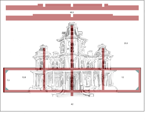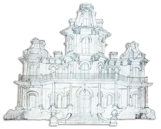 Much of the Lanneau-Norwood House’s anachronistic charm is in her decorative details. The architect ordered these details on a solid, well-proportioned structure. Befitting the era in which she was built, the House is a symphony of patterns and variations on a theme. I intend for the finished piece to have a painterly quality. I’m not trying for photo-realism. I want it to look like a painting. But, at the same time, it will be a painting of a building with complex detail. The underlying structure must be solid. A few sloppily placed details and the whole thing could resemble a melting wedding cake! A tight under-drawing is necessary to loosely apply paint.