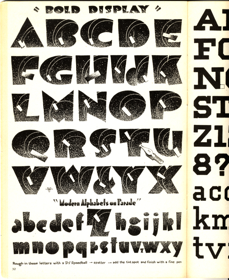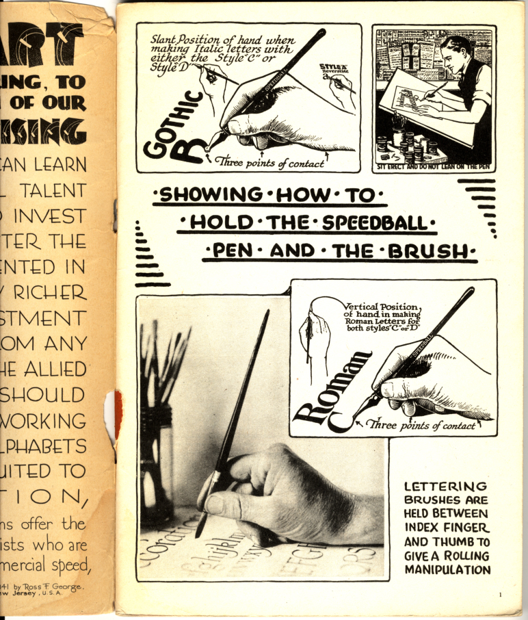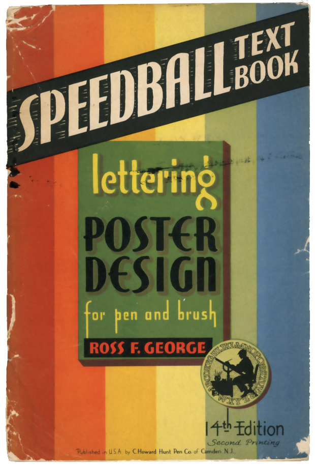 Some of what I have in boxes and on shelves are a few of the things that first taught me how to make things to see. Like this really cool 1941 version of the Speedball Text Book. Speedball was—and continues to be—a manufacturer of calligraphy and ink pen drawing tools. From time to time, they published these little how-to booklets to encourage sale of their products. I used to spend hours copying various lettering exercises. Thus began my lifelong love of typography and lettering and (ahem!) signs. Turns out, these little manuals are a pretty good introductory course to graphic design, or, as they called it in the olden days, “commercial art”.