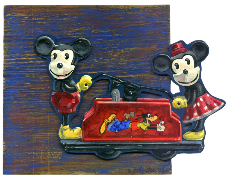 But, as I’ve said before, I’m not a symmetrical kinda guy. Or, at least, artist. I like the surprise and precariousness of asymmetry. I took the cut out, complex shape of the object and placed it on a simple square—off center. The fact that we tend to read left to right and, as the little Goofy illustration on the red box indicates, the car is visually moving to the right. So I have it zipping off the square to the right.