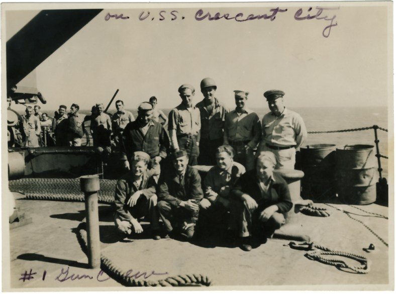 It’s a candid shot, taken aboard his ship, the USS Crescent City, probably in spring or early summer, 1942. These guys don’t know it yet, but they are on their way to Guadalcanal. The Crescent City is a troop transport. On board, as well, are over 1,000 Marines of the 2nd Marine Division. The #1 gun is an anti-aircraft gun on the bow of the ship. This gun and its crew are crucial in protecting those Marines when the invasion of Guadalcanal begins.