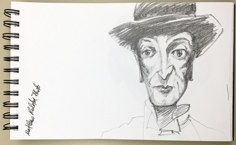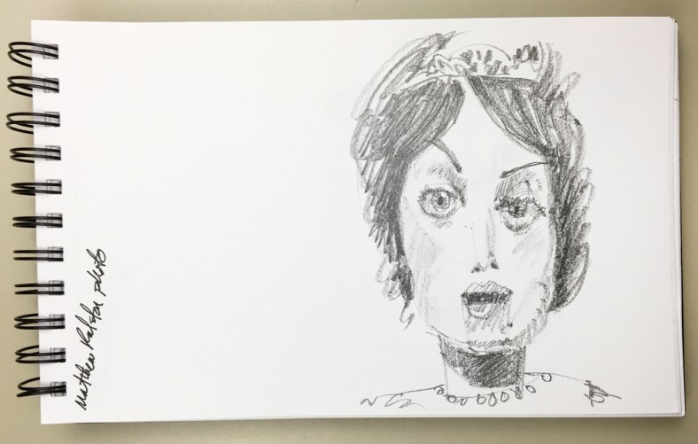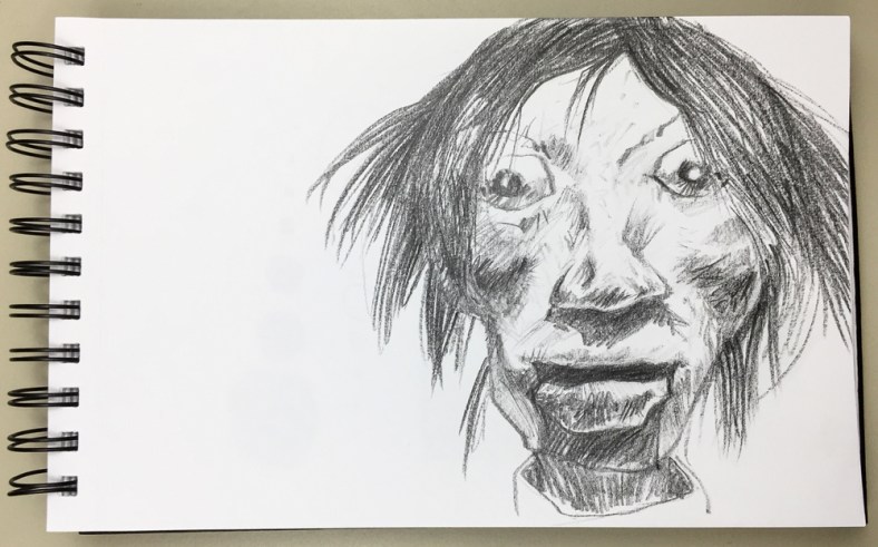 Nothing visually connects with us like a human face staring back. I made a few pencil sketches from the photos. Odd; looking at sketches of photos of caricature models of human faces looking at us.