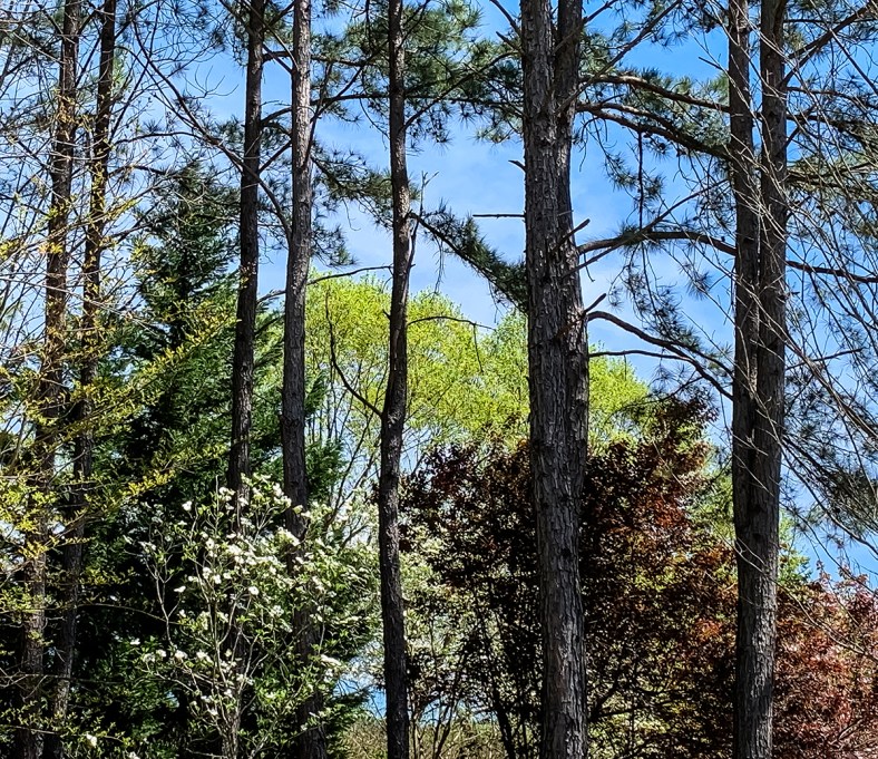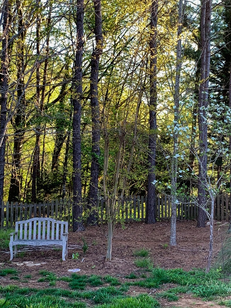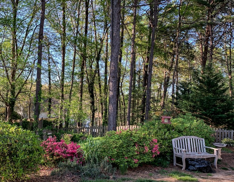 The COVID virus is a force of nature. More than inconvenient, it is terrifying and tragic. To us. But another force of nature is unperturbed: spring. The season has erupted with its usual exuberance. My backyard is good place to watch this. I’m trying for a natural, woodsy feel. Or maybe the natural, woodsy feel is just taking over no matter what I try. Okay, it’s more like raggedy, overgrown abundance.