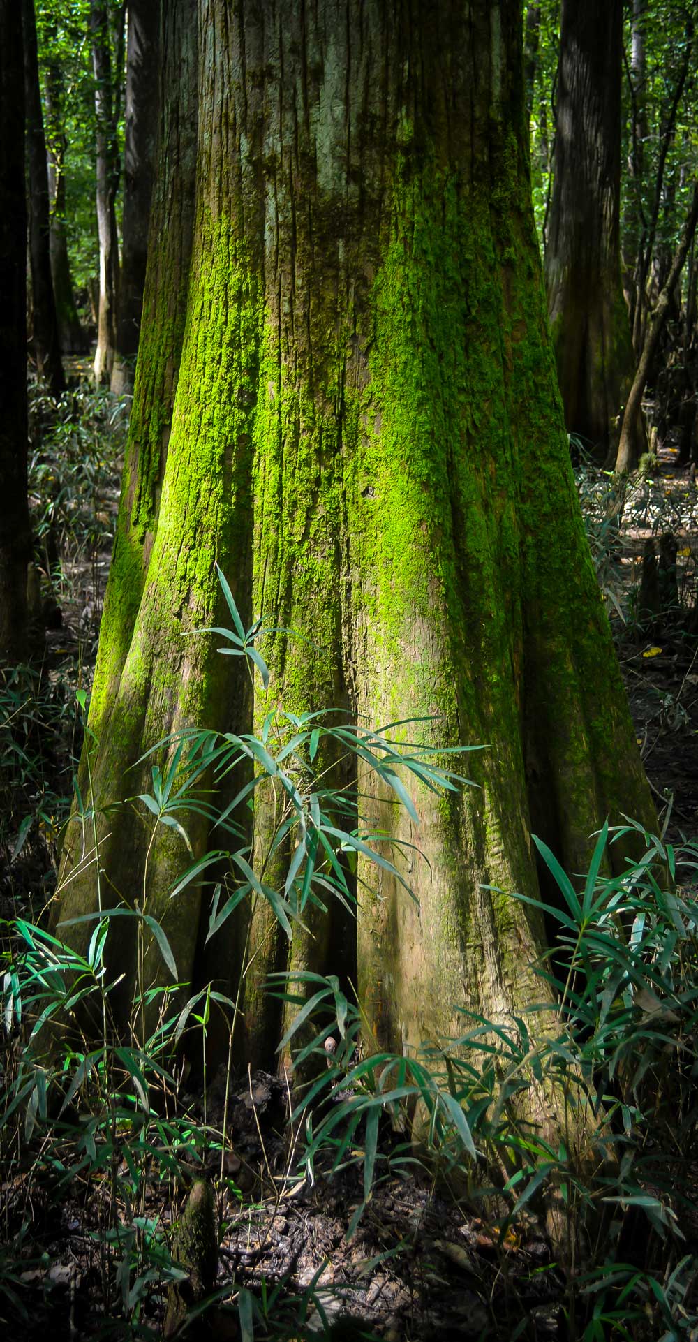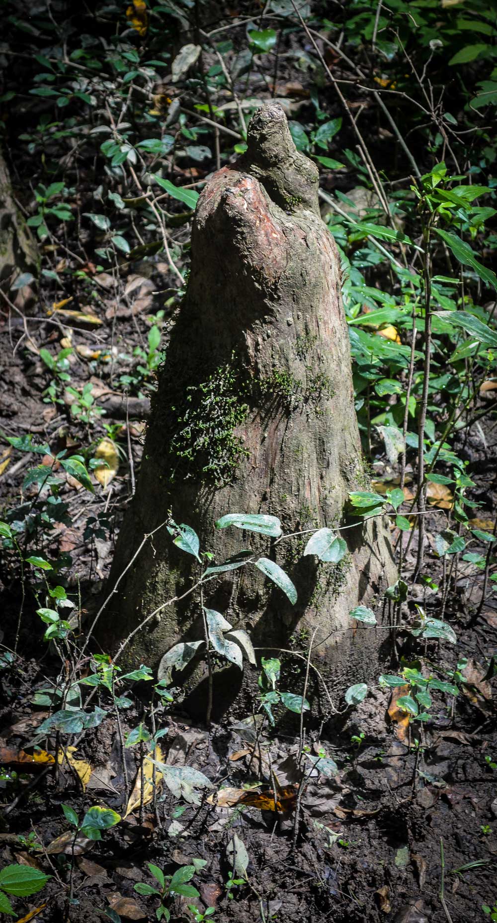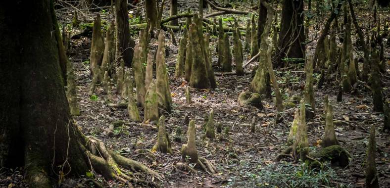 “Knees” of bald cypress grow up from the roots throughout the forest floor. Their function is not entirely understood, but seem to offer structural support during floods and high winds. My guess is they might disrupt the force of a flood’s current like rocks in a stream.