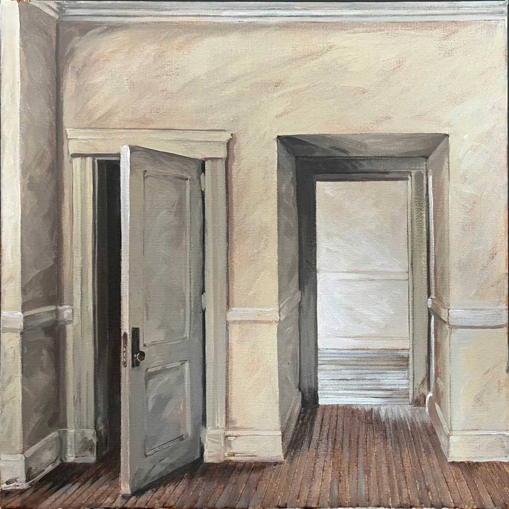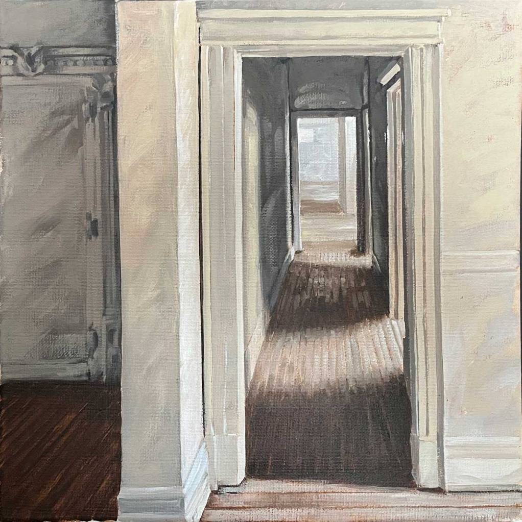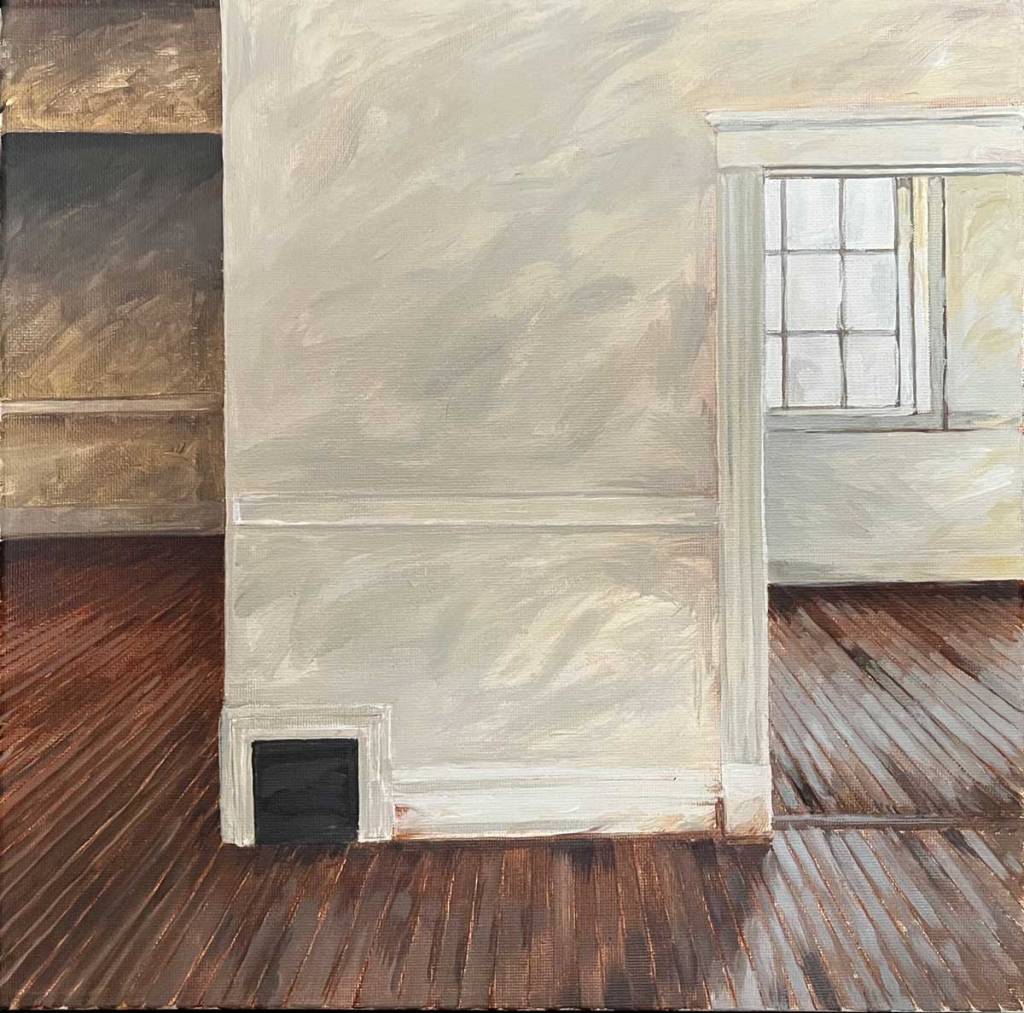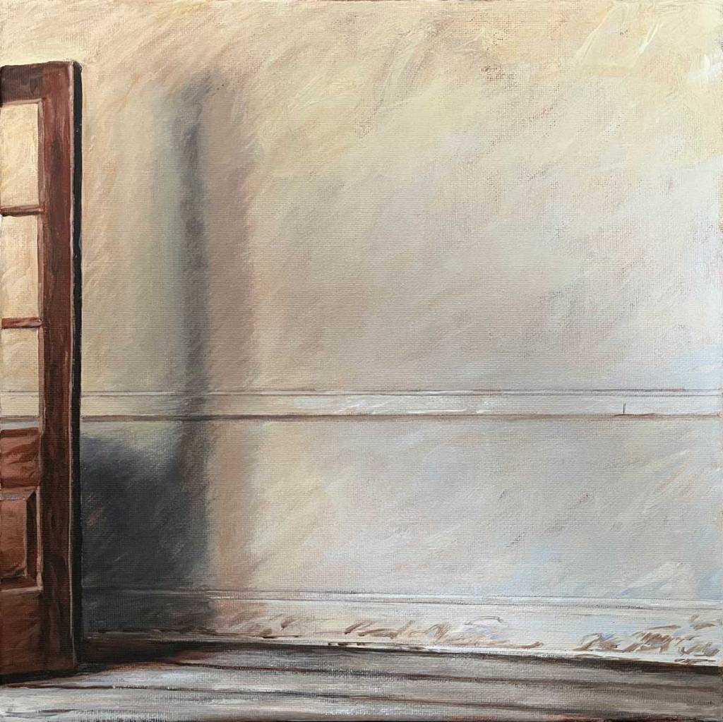 These are part of an ongoing series of small (12″ x 12″) acrylic paintings based on photos I took at an empty textile mill a few years ago.