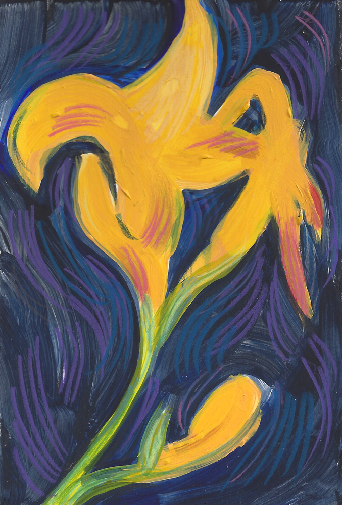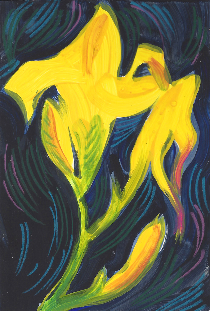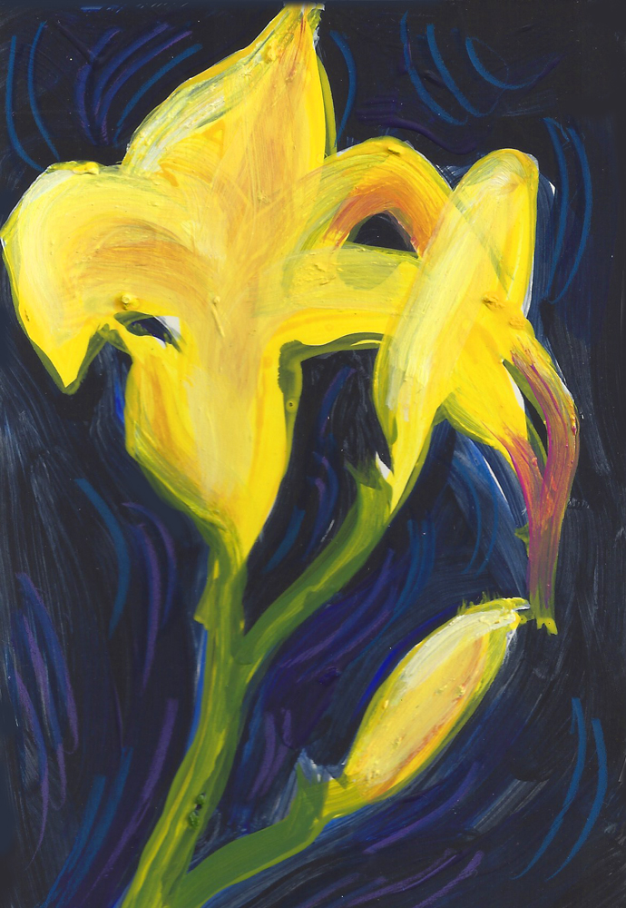 Here’s a series of quickly painted acrylic and colored pencil sketches of a lily on 4″ x 6″ cards. The idea was to catch something of the abstract shapes the flowers suggested against the dark background, not reproduce its image. Freed from a literal interpretation, my eye caught different things with each application. Sometimes, I looked at the shape of the flower; sometimes, the negative space. Different results every time.
