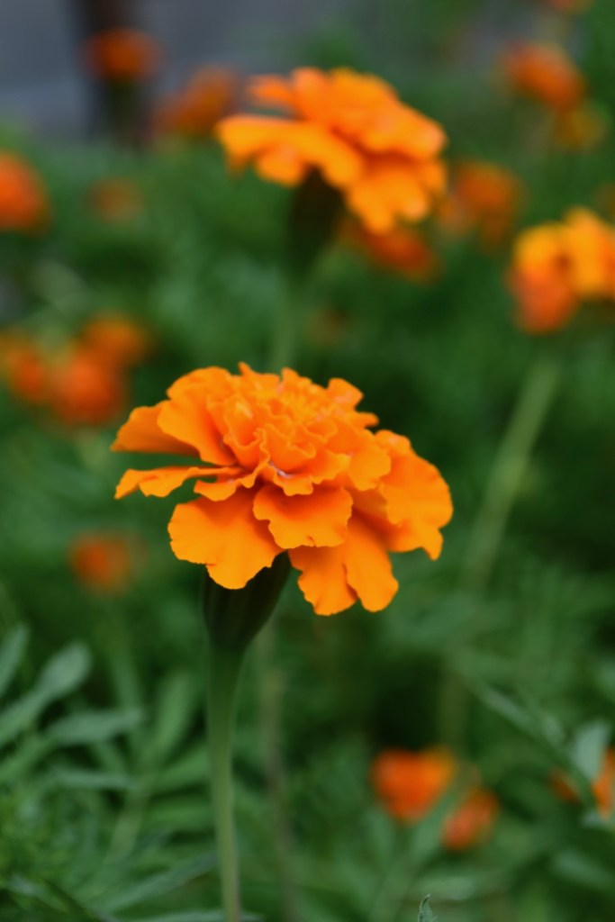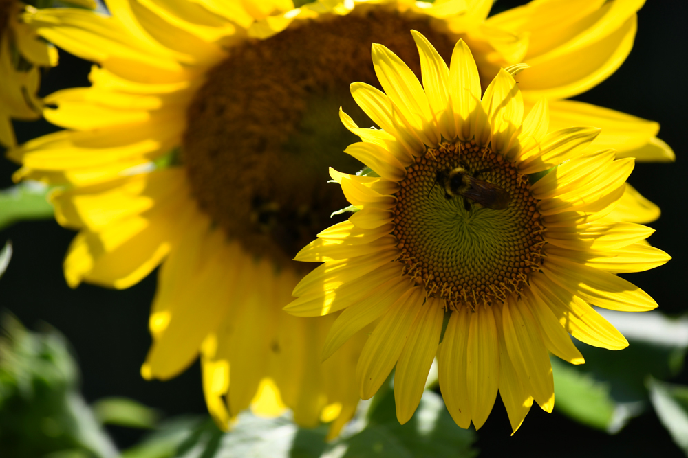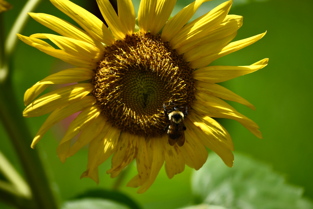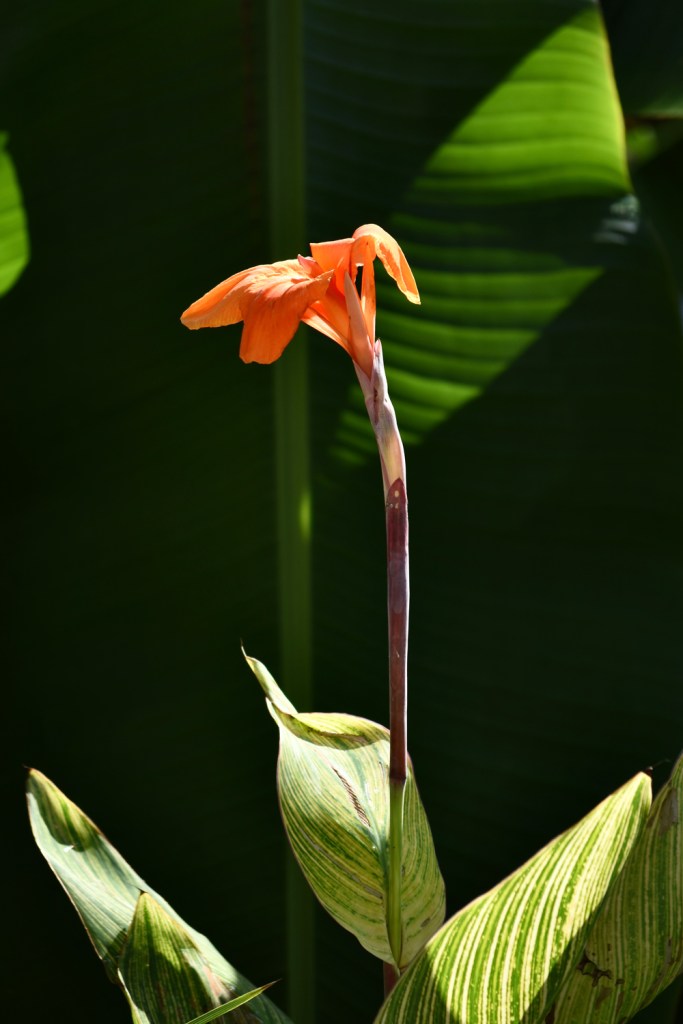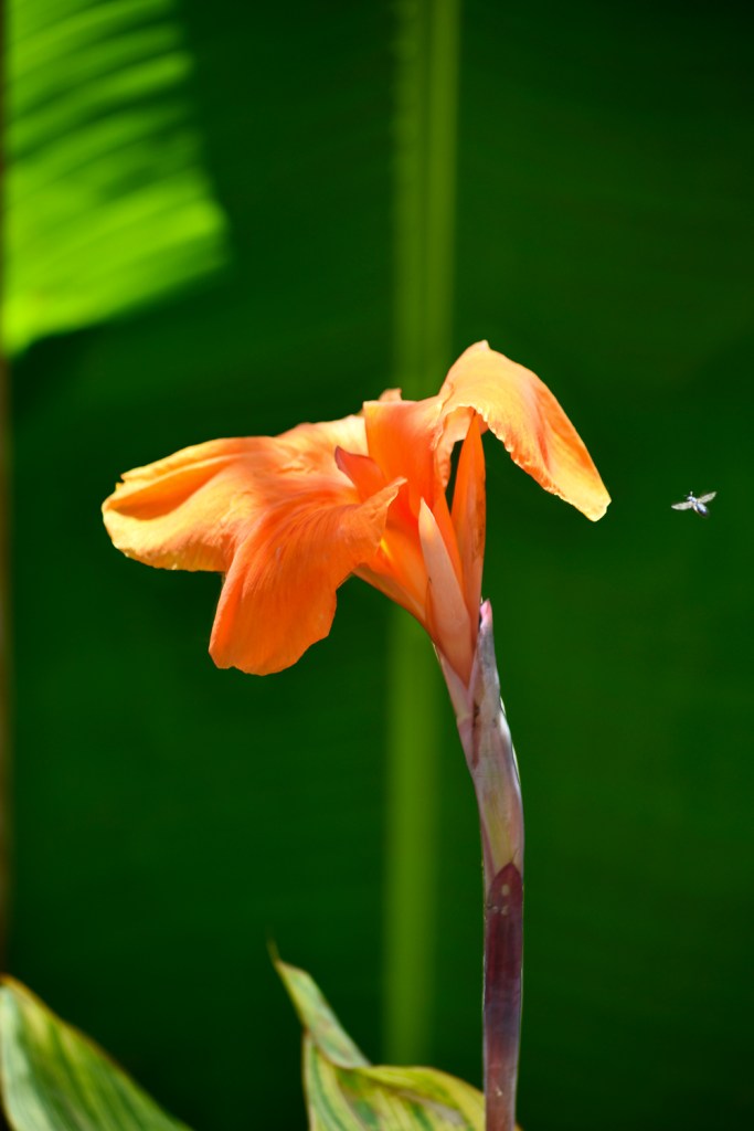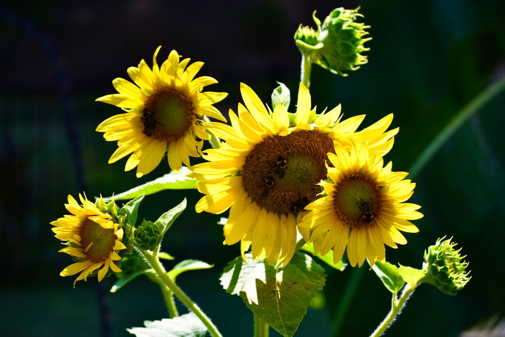 Cana flower in late afternoon against the leaves of a Banana tree.Baby sunflowerCluster of sunflowers in late afternoon sun.Several varieties of bees work the sunflowers from early morning until sunset. A few bees will remain on the flowers and sleep, head-up, until dawn. And then resume their labors.Marigolds, if left to seed one year, will come back the next with increased abundance.